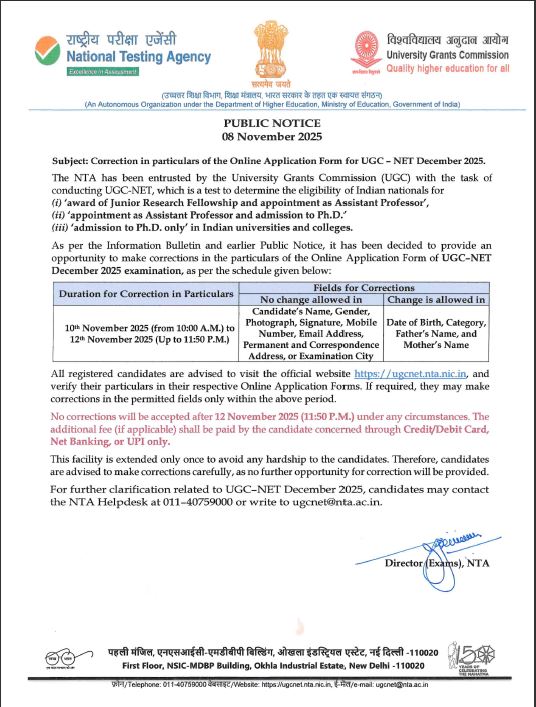 NTA UGC NET December 2025 Correction Form